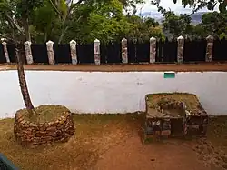 The compound Mahandrihono ("knows how to wait") is the most expansive and well-preserved of the rova structures at Ambohimanga.[15] It lies to the east of the central courtyard and sits at a higher elevation than Bevato, symbolically representing its greater political significance. It was first established by Andriambelomasina in the early 18th century during the reign of his father, Andriantsimitoviaminiandriana. Andriambelomasina surrounded the compound with a stone wall and within it built three houses as residences for his children—two twin houses (tranokambana) set side by side named Mahandry ("knows how to wait") and Tsararay ("has a good father"), and a third named Manandraimanjaka ("has a father who rules")—taking pains to illustrate through the names of these houses that he had no intention of usurping his father. When Andriantsimitoviaminiandriana eventually died, Andriambelomasina entombed him behind the twin houses.[12] In Andrianampoinimerina's time this compound corresponded with the Mahandrihono compound at the rova in Antananarivo, being reserved for the king alone with his residence positioned beside the tombs of the ancestors.[26]
