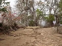 The Nanjakana compound is the most highly elevated of the three compounds in the rova at Ambohimanga. Located to the northeast of Mahandrinoro,[12] this compound is believed to have been first constructed by Andrianjafy in the late eighteenth century.[15] To the north of the compound is a stone esplanade that offers a clear view of the surrounding areas where Andrianampoinimerina reportedly came to reflect on his military strategy for bringing Imerina under his control.[36] During the 1861 funeral of Queen Ranavalona I held in the Nanjakana compound, a spark accidentally ignited a nearby barrel of gunpowder destined for use in the ceremony, causing an explosion and fire that killed a number of bystanders and destroyed three of the compound's historic royal residences.[36]
