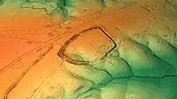 The first dig at Ambresbury Banks was initiated by the Essex Field Club in 1881, under general Augustus Pitt Rivers.[5] Another dig under Hazzeldine Warren in 1933 found sherds of pottery.[6] In 1971 & 2 Iron Age gold coins were found near the Banks using a metal detector.[7] Flints and an arrowhead have also been found at the site[8][9] Materials including a clay smoking pipe and a horseshoe have been recovered at the site.[10]