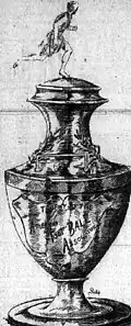 The trophy was made by Tiffany & Co. and is described as "a very elegant sterling silver trophy. It is a vase about thirteen inches high surmounted by a Roman athlete. On either side is a foot ball and goal post, while in front on a large shield is the inscription".[11]