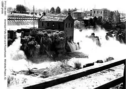 The dam at American Falls is on the Snake River Plain at an elevation of 4,357 feet (1,328 m) above sea level.[4] The topography near the river is gently rolling, with differences in elevation of less than two hundred feet (60 m). The original falls occur where the river channel narrows to about 600 feet (180 m) and cascades about fifty feet (15 m) in several 6-to-10-foot (2 to 3 m) drops over highly jointed basalt.[5] The final drop is a plunge of about fifteen feet (4.6 m).
