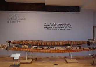 Asmat art is widely collected in major Western museums despite the difficulty in visiting the remote region to collect work;[3] the "exceptionally expressive" art "caused a sensation in art-collecting circles" which led to large-scale collecting expeditions in the post-WWII era, according to art scholar and ethnologist Dirk A.M. Smidt.[4] The gallery includes a permanent display of Asmat works such as ancestor poles (bis) and canoes, and a rotating exhibition highlighting aspects of Asmat art and culture. Much of the collection is accessible through the museum's online database.