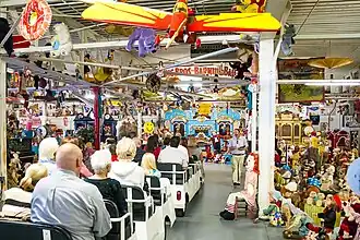 The Toy Box takes up the majority of the space in the American Treasure Tour Museum. Visitors are driven in an electric tram down lanes displayed with an eclectic collection of Americana on both sides and hanging from the ceiling. Tram tours are conducted with an audio track describing the items, including: automatons, model airplanes, classic cars, more automatic musical instruments, original artwork, movie memorabilia and Disneyana, stuffed animals, animated store displays, motorcycles, holiday displays and neon signage.[18] Highlights include: