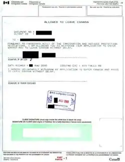 "Allowed to Leave Canada" form (as of 2008) issued by CIC to an inadmissible person