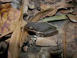 Their dorsum can range in color from the more common bright green to reddish-brown. Their moist skin is ventrally smooth and dorsally granular.[13] Such a range in coloration may result in the frog being mistaken for other species.[2][14] Some evidence suggests that green tree frogs can exhibit a color change in response to their background and/or temperature.[15]