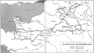 The commander of the 2nd Military Railway Service, Brigadier General Clarence L. Burpee, arrived in Normandy on 17 June, and by the end of July the 707th Railway Grand Division had the 720th, 728th and 729th Railway Operating Battalions and the 757th Shop Battalion operational.[59] French civilian railway workers were employed whenever possible. Railway operations commenced in early July. Major General Frank S. Ross, the European Theater of Operations (ETO) Chief of Transportation, rode the line from Cherbourg to Carentan in a jeep equipped with flanged wheels.[58] Immediately after Operation Cobra began, the 347th Engineer General Service Regiment was withdrawn from its work on the port of Cherbourg and set to work rehabilitating the railway lines, which had been badly damaged by the Allied Air Forces during earlier aerial interdiction bombing. It started by repairing the masonry bridge over the Vire River on the Saint-Lô line, constructing a timber trestle bridge to replace a missing span. At Coutances, it replaced a missing span of a viaduct bridge. Reconstruction of the marshaling yards at Saint-Lô was a major task, as they had been almost completely destroyed.[60]