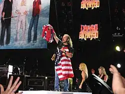 In the late 1970s Eddie Van Halen established himself as a metal guitar virtuoso after his band's self-titled 1978 album.[120] Inspired by Van Halen's success and the new wave of British heavy metal, a metal scene began to develop in Southern California from the late 1970s, based on the clubs of L.A.'s Sunset Strip and including such bands as Quiet Riot, Ratt, Mötley Crüe, and W.A.S.P., who, along with similarly styled acts such as New York's Twisted Sister, incorporated the theatrics (and sometimes makeup) of glam rock acts like Alice Cooper and Kiss.[120] The lyrics of these glam metal bands characteristically emphasized hedonism and wild behavior and musically were distinguished by rapid-fire shred guitar solos, anthemic choruses, and a relatively melodic, pop-oriented approach.[120] By the mid-1980s bands were beginning to emerge from the L.A. scene that pursued a less glam image and a rawer sound, particularly Guns N' Roses, breaking through with the chart-topping Appetite for Destruction (1987), and Jane's Addiction, who emerged with their major label debut Nothing's Shocking, the following year.[121]