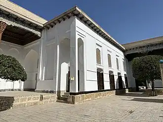 The architectural complex dates back to the 19th century and is surrounded by large stained-glass windows. During the reign of Amir Muzaffar Khan, he paid attention to both religious and secular affairs. Amir Muzaffar Khan left a will to his son 'Abd al-Ahad Khan: "I bequeath to you that you always be pious and diet. Follow the commandments of Islamic law and the Sunnah of the Messenger of Allah, peace be upon him. We are all those who are going from this mortal world to the next".[1] The mosque has a porch on the outside and it consists of 5 pillars[2] Large candlesticks, lanterns and ostrich eggs were hung in this mosque. Also, they were rotated in porch of the mosque by the force of the wind. The exterior of the building consists of glazed windows and 2 doors. The interior of the mosque has columns and a mihrab in the middle. But in 1940–1950 they were demolished. This situation can be seen in archive photos. During the years of Uzbekistan's independence (in 1991), the Amir Muzaffarkhan Mosque was renovated by builders led by Bukhara architects Ahmed Bobomatov and Ochil Bobomurodov. Gaybulla Barotov, Mubin Mominov, Naim Sharipov, Maqsud Mominov, Shavkat Mominov, Shakir Mominov took part in the renovation of the interior of the mosque. The mosque was built in the style of Central Asian architecture. Amir Muzaffarkhan mosque was built using brick, wood, stone and concrete.[3]