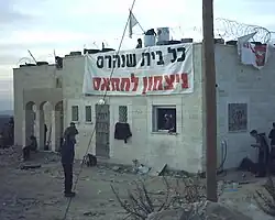An Israeli home in Amona before the destruction by the Israel Defense Forces. The sign reads "Every house destroyed a victory for Hamas."