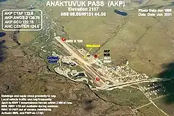 Anaktuvuk Pass Airport (IATA: AKP[2], ICAO: PAKP, FAA LID: AKP) is a public use airport located in Anaktuvuk Pass,[1] a city in the North Slope Borough of the U.S. state of Alaska. The airport is owned by North Slope Borough.[1]