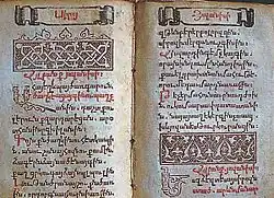 The social-political and cultural upheaval that began in the first half of the 17th century also affected literary literature. Alongside the development of the art of copying ancient manuscripts, printing, and folklore, new literary values were created.[203] At the same time, due to the political situation, the changes of the new era slowly penetrated into Armenia. The 17th-18th centuries essentially continued and completed medieval literature.[13] At this time, the ideology of the Armenian national liberation movement and the bourgeois trade was also forming. Lyrics remained the leading literary genre. According to Henrikh Bakhchinyan, the three main directions of its development were religious-patriotic poetry, secular poetry, and folk gusan songs. Despite their unique features, these directions were not strictly differentiated and represented mutual influences within the framework of the unified artistic thinking of that time. Sometimes in the works of one author, one can see different poetic directions of the era. In this sense, the creativity of Martiros Ghrimetsi from "The Armenian Grimoire," combining religious hymns, secular poetry, and pastoral poetry, is characteristic.[204] As noticed by S. La Porta, the opposition between religious and secular literature represents a false dichotomy: "Instead, they should be seen as brothers and sisters sharing one destiny".[205] All dominant tendencies reflected literary continuity with subsequent linguistic-poetic properties, themes, and directions. For example, religious-patriotic poetry repeated and developed a similar medieval tradition. Its language was mainly grabar, sometimes Middle Armenian, and the themes were taken from the Bible or Armenian history. It had enlightenment goals, with the audience mainly being future leaders and enlighteners of the church. In turn, religious-patriotic poetry is divided into three parts: purely religious, national-church, and historical-political. Purely religious poetry lagged behind in its artistic qualities compared to similar medieval works, which was a consequence of the dominance of religious ideals over secular ones in the modern era. However, religious poetry acquired a greater social mission. National-church poetry of the 18th century gained particular weight, synthesizing biblical and Armenian national plots. Historical-political poetry, reflecting the military past and present of the Armenian people, its liberation aspirations, also developed.[204] Most poets of the 17th century were representatives of the common people, which largely determined the ideological aspect of their literature.[88] Secular themes and thematic diversity predominated in literature as a whole.[206]