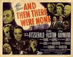 And Then There Were None is a 1945 film adaptation of Agatha Christie's 1939 mystery novel of the same name, directed by René Clair.[3] It was released in the United Kingdom as Ten Little Indians,[4] in keeping with the third United Kingdom title of Christie's novel.[5] The film was released by 20th Century Fox and due to the lapsed copyright, it is now in the public domain.[6] The film has been remastered multiple times and is freely available online.[7]
