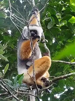 Andasibe-Mantadia National Park is a 155 square kilometre protected area, located about 150 km east of Antananarivo, consisting principally of primary growth forest in the Alaotra-Mangoro Region in eastern Madagascar. The park's elevation ranges from 800 to 1260 meters, with a humid climate. Average annual precipitation is 1700 mm, with rainfall on 210 days of each year. This rainforest is habitat to a vast species biodiversity, including many endemic rare species and endangered species, including 11 lemur species. The park's two component parts are Mantadia National Park and Analamazoatra Reserve, which is best known for its population of Madagascar's largest lemur, the indri.[2]