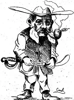 Caricature of Andrés Baquero. In his hands he holds a sabre with the name "Antonete", due to a controversy of the time about the authenticity of the weapon that was then exposed in the Provincial Museum as belonging to the revolutionary Antonio Gálvez Arce.