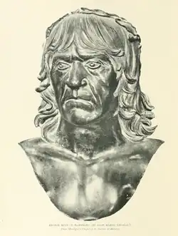 After the death of his wife and at an advanced age Mantegna became the father of an illegitimate son, Giovanni Andrea; and, finally, although he continued embarking on various expenses and schemes, he had serious tribulations, such as the banishment from Mantua of his son Francesco, who had incurred the displeasure of the Marchese. The difficult situation of the aged master and connoisseur required the hard necessity of parting with a beloved antique bust of Faustina.[10]