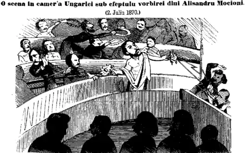 For a while, the Romanians of Banat continued to plead with the emperor for Romanian self-rule in the Banat. One such petition, circulated in December 1863, also asked Franz Joseph to surround himself with Romanian advisers, including "Andrea de Mocioni, lord of Foeni", a man distinguished by "political, patriotic, and national virtues".[87] As noted by historian Tudor-Radu Tiron, the restoration of Hungarian rule ultimately pushed the Mocionis back into Hungarian politics, which explains why Andrei, Anton and Gheorghe all took seats in the last Diet of Hungary (1865).[88] Elected at Lugoj, Andrei served from December 14, 1865, and joined the Deák Party during his tenure; the other brothers were independent Romanian deputies.[89] Alexandru also won a Rittberg seat in that legislature. Known as the theoretician of national liberalism, he was a main proponent of the Nationalities Bill, which, if adopted, would have set up autonomous units for the Romanians in Hungary.[90]