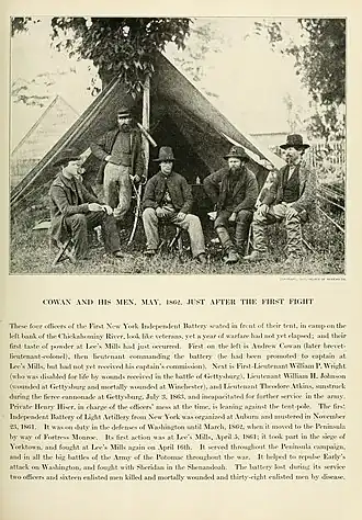 The 1st New York Battery was recruited by Capt Terance J. Kennedy, mostly in Cayuga County, beginning on October 18, 1861. The battery was organized at Auburn, New York.[5] Andrew Cowan was commissioned as the unit's first lieutenant. The battery was mustered into the service as a volunteer unit for a term of three years on November 23. The battery arrived in Washington, D.C., on December 4.[4] Officially designated the 1st New York Battery three days later, it was assigned to BG William F. Smith's division of the Army of the Potomac in January 1862. The division joined IV Corps in March of, 1862. The division joined VI Corps in May 1862, serving in the Peninsula Campaign. By that time, Lt Cowan was in charge. He was promoted to the rank of captain during the Peninsula Campaign.[6]