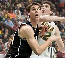 During his sophomore year, Smith played in all 38 games, starting 32.[2] After Butler got off to a mediocre 3–2 start, Smith was added to the starting lineup.[1] Against Cleveland State, he scored a career-high 22 points and collected 10 rebounds to get his first collegiate double-double. In the final game of the regular season, he played a career-high 36 minutes and recorded 11 rebounds, 3 steals, and 3 blocks, all career highs.[2] Thanks in large part to Smith's emergence as a starter, Butler returned to the NCAA Tournament.[4] During the round of 32, Smith hit a go-ahead basket with less than 3 seconds on the clock to help Butler beat top seeded Pittsburgh.[2] In Butler's sweet 16 match against Wisconsin, Smith hurt his ankle and left the game.[4] However, he returned before the game's end, collecting eight points and six rebounds as Butler advanced to the regional final.[4] Butler again advanced to the Championship game. Smith led the team in rebounding in the regional final against Florida and in the National Championship game against Connecticut.[2] He finished the year as the team's second-leading rebounder (5.6 per game) and third-leading scorer (8.5).[2][7] He made 59.3% of his field goal attempts and 67.3% of his free throws.[7]