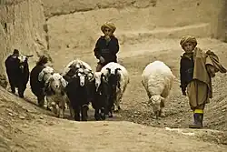 Animal husbandry in Afghanistan is a traditional way of life, which exists in all 34 provinces of the country, and plays an important role in the nation's economy.[1] The livestock in Afghanistan mainly include sheep, cattle, and goats. All of these produce red meat and dairy products for local consumption.[2][3][4] Weddings, zakats and the annual Eid al-Adha boost the sale of these animals. As a totally Islamic country, pig farming and consumption of pork are simply nonexistent. The wool of the slaughtered sheep is used to make Afghan rugs, clothing, and other products.[5][6][7]