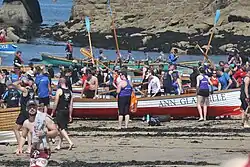 Ann formed a crew of four female rowers who took part in local regattas; she was noted for her large stature and for her crew who dressed in white caps and dresses. Their success led to competitions all over the country; one event at Fleetwood was watched by Queen Victoria, who congratulated Ann when they won by beating an all-male crew. The most famous competition was said to have been in 1833 when they visited Le Havre and beat the best ten French male crews by 100 yards; this led the press to call her the champion female rower of the world.[1][2][3] However, recent research by A T Goodman for the Old Cornwall Society has thrown doubt on this version of events. The visit to Le Havre was actually in August 1842 aboard the paddle steamer Grand Turk; the French refused to put up a team to row against women and so a demonstration race was conducted between Ann Glanville's female crew and male rowers from the Grand Turk, which was won by the women.[2]