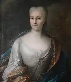 Anna Constantia von Brockdorff (17 October 1680 – 31 March 1765), later the Countess of Cosel, was a German lady-in-waiting and noblewoman, and mistress of Augustus the Strong, King of Poland and Elector of Saxony, in 1706–1713. Eventually he turned against her and exiled her to Saxony, where she died after 49 years of internal exile.