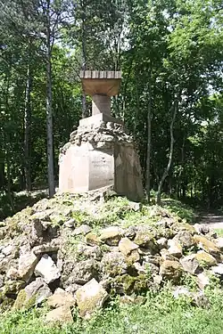 The first monument of Anna Dorota Chrzanowska erected in Trembowla in 1683 was last mentioned in 1829. Subsequently, in 1900, a second one was erected on the same site, work of Terebovlian sculptor J. Bohenek. It was destroyed in 1944 by Soviet troops. In 1982, the hill where monument once stood was rebuilt, and the slab was built, and the plate that remained undamaged was secured. On this spot opening of the third monument took place in July 2012, work of Roman Vilgushinsky.[2]