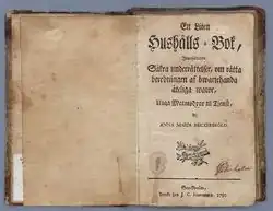 In 1785, fifteen years after she wrote her plea for female household education, Rückerschöld published En Liten Hushålls-Bok ( "A Small Household Book"). It was published in her own name, and contains various practical advice on efficient household management; cooking, cleaning, washing, brewing, butchering, etc. Rückerschöld was influenced by the mercantilistic economic ideas of her time, and advised readers to take better advantage of local produce, such as berries and mushrooms and using locally available products in favor of imports, such as substitution of wine with juice or vinegar made from homegrown fruit. There are few actual recipes for cooking, and all of them describe more everyday dishes such as simpler porridge and soup. For more refined cooking, Rückerschöld recommended other contemporary cookbooks, of which Cajsa Warg's is described as the foremost.[9]