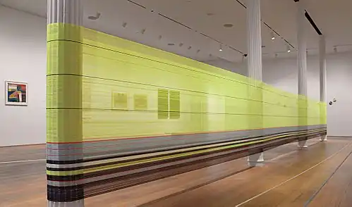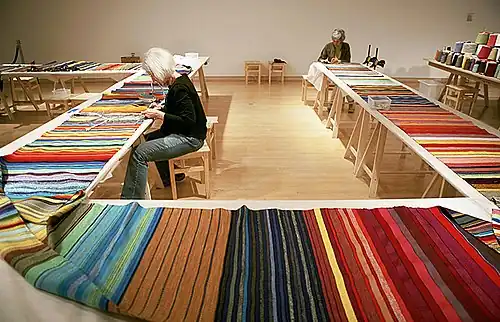 In 2010, Wilson produced one of her most ambitious installations at the Knoxville Museum of Art in East Tennessee. Local Industry, a central component of the exhibition Anne Wilson: Wind/Rewind/Weave, was a site-specific installation as a collaborative "textile factory".[14] From January 22 through April 25, 2010, visitors to the Knoxville Museum of Art worked together to produce a bolt of cloth. Wilson conceived of Wind/Rewind/Weave as a meditation on labor, acknowledging the specific geographic location of the Knoxville Museum of Art in the historical heartland of both hand weaving traditions and textile mill production in the United States. The Local Industry cloth, 75.9 feet (23.1 m) long, was on display at the Knoxville Museum of Art in 2011.[15]