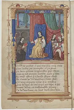 Not long after her marriage, Anne de Graville served at the court of Queen Claude of France, eldest daughter of Louis XII and Anne of Brittany; Claude became the wife of the future Francis I in 1514, the year before he ascended the throne. Anne was likely her dame d'honneur.[6] Queen Claude's court was notable for its austere and respectable modes of life which contrasted with the promiscuous ways of her husband.[7] She created and dedicated several texts to the queen during her tenure there, from 1515 to 1524.