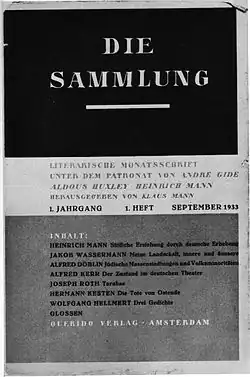Schwarzenbach's lifestyle ended with the Nazi takeover in 1933, when bohemian Berlin disappeared. Tensions with her family increased, as some members sympathised with the far-right Swiss Fronts, which favoured closer ties with Nazi Germany. Her parents urged Schwarzenbach to renounce her friendship with the Manns and help with the reconstruction of Germany under Hitler. This she could not do, since she was a committed anti-Fascist and her circle included Jews and political refugees from Germany. Instead, later on, she helped Klaus Mann finance an anti-Fascist literary review, Die Sammlung, which helped writers in exile from Germany by publishing their articles and short stories.[3] The pressure she felt led her to attempt suicide, which caused a scandal among her family and their conservative circle in Switzerland.