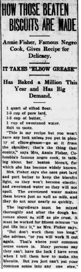 Fisher's beaten biscuits became so popular that Missourians who had moved out of state would mail order her biscuits to be delivered to states as far away as New York and California. Annie cooked in what she referred to as, "old Missouri style," which meant she used local ingredients to give her food a distinct flavor. Her cooking became so popular that she began endorsing local businesses such as the Boone County Mill's H-P flour which she used in her famous biscuits.[5] In 1911, a Sedalia hostess who handled catering for the Missouri State fair made sure Fisher's biscuits were on the presidential table for William Howard Taft's visit.
