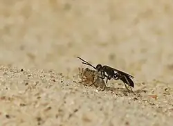 The flight period in Great Britain is May to September,[5] although in northern California adults have been collected in May, June and July.[6] Prey collected by A. nigerrimus include spiders from the families Lycosidae, Gnaphosidae and Pisauridae. A nigerrimus builds nests under stones, in cavities in stone walls, in hollow plant stems, in deserted burrows of ants, bees or wasps, and in empty snail shells. It can also dig a burrow and build cells in friable soil.[5][6] One nest of four cells was found under a stone on moorland at an altitude of 400 m in Glen Tilt, near Blair Atholl, Perthshire. Flowers visited include umbellifers such as wild carrot and Heracleum sphondylium.[5][7] The eulophid wasp, Tetrastichus pompilicola has been reared from larvae of A. nigerrimus in Newfoundland.[2]