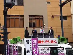 Anri Kawai (河井 案里, Kawai Anri; born 23 September 1973) is a Japanese politician, formerly of the Liberal Democratic Party, and a former member of the House of Councillors in the Diet. Her husband is member of the House of Representatives and former Minister of Justice Katsuyuki Kawai. Born in Nobeoka, Miyazaki and a graduate of Keio University, she served in the assembly of Hiroshima Prefecture for four terms. On 20 January 2021, at the Tokyo District Court, she was convicted of vote-buying in the 2019 House of Councillors election.[1]