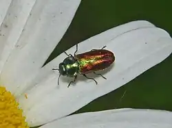 Anthaxia thalassophila can reach a length of 4–6 millimetres (0.16–0.24 in).[2] This species is characterized by the brilliance of its colors: bright green and dark red with metallic reflections in the females, while the males in place of the red present a bright yellow color with a reddish sheen.