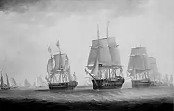Being returned to England, he was, in 1795, appointed to La Concorde of 36 guns, and for some time formed one of the squadron of frigates under the command of Sir J. B. Warren, off the coast of France.[2] In 1796 he was promoted from the Concorde to the Virginie of 44 guns, a French ship recently captured by the British, then refitting at Plymouth.[2] He sailed in her from thence in November 1796, and, after several cruises in the English Channel, was ordered in June 1797 to sail from Portsmouth to Harwich to take the Princess of Wurtemburgh to Cuxhaven.[2] The squadron was composed of the Revolutionnaire of 44 guns, under Captain Francis Cole, commodore; La Virginie of 44 guns, under Captain Anthony Hunt; and the Melampus of 36 guns, under Captain Graham Moore.[2]