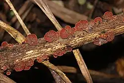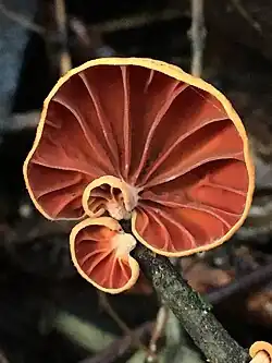 Fruit bodies are rust coloured to dark red, and are fan shaped. They grow in groups on dead twigs.[6] Caps are on average 3–20 mm (0.1–0.8 in) diameter.[7][2] Horizontal caps are attached laterally to substrate and are sessile with a very small thickened stem like point. Shapes range from reniform to almost circular, convex,[6] and almost symmetrical, deeply grooved radiating from point of attachment, following gill outline [7] Pileus is coloured creamy pale pink to reddish brown, and smooth, when young covered in scaly whitish dust.[4] Gills are orange to brown, widely spaced,[3] and radiating from the pale, thickened point of attachment to the substrate.[6] Spores are translucent, 7.5–12.5 μm long, and 5–8 μm wide,[3][7] with a white spore print. Context is 1–2 mm (0.04–0.08 in) thick, and pale with a thickened wall.[4]