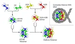 Histones are complexes of proteins, around which DNA is stored. Anti-histone antibodies may target the histone complex or any of the protein subunits shown here.