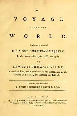 - ^ Bougainville, Louis Antoine de (1772) [1771]. Voyage autour du monde [A Voyage Round the World Performed by Order of His Most Christian Majesty In the Year 1766, 1767, 1768, and 1769]. Translated by Foster, John Reinhold. London: J. Nourse. p. 32.