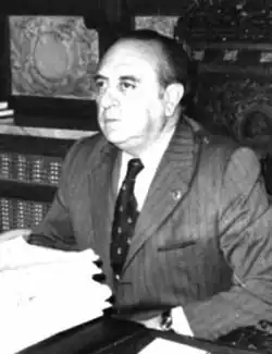 Antolín Luis de Santiago y Juárez (born 9 October 1918, date of death unknown) was a Spanish politician, lawyer, academic and journalist[11] He was a member of the FET y de las JONS party, and was the Mayor of Valladolid from 12 August 1971 to 12 February 1974.[12] He was worked as a representative in the city of information and tourism in Valladolid.[13] He served as the civil governor of the Province of Cádiz from February 1974 to August 1977, who was also re-elected to the civil governor of the Province of Burgos, in office from August 1977 to July 1980.[14] He retired from politics after 1980.[15] He was the procurator in the francoist courts from 1971 to 1974. After his son came into politics, he moved away from politics after that.[16]