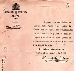 - ^ a b c d e f g h i Sánchez Montoya, Francisco (10 March 2017). "Antonia Pérez Padín: Memoria de una luchadora contra el franquismo". El Faro de Ceuta (in European Spanish). Retrieved 16 February 2019.