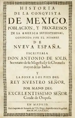 The Historia de la conquista de México, población y progresos de la América septentrional, conocida por el nombre de Nueva España, covering the three years between the appointment of Cortés to command the invading force and the fall of the city, deservedly ranks as a Spanish prose classic. It was first published in 1684 in Spain. French and Italian translations were published by the 1690s, and an English translation by Townshend appeared in 1724.[1] The book was extremely popular on both sides of the Atlantic and was known to important figures in colonial Latin America and the British colonies. It remained the most important European source on Latin American history up through the first part of the nineteenth century.