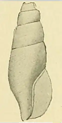 The spire is elevated, conic, somewhat higher than the aperture. The outlines are faintly convex. The protoconch is broken off in all the four specimens at disposal. The shell contains 5 to 6 whorls, lightly convex and rather rapidly increasing. The base of the shell is contracted. The suture is linear and well impressed. The aperture is subrhomboidal, the sides parallel, angled above, with a short, broad, and slightly emarginate siphonal canal below. The outer lip is moderately convex, acutely curved, and sometimes a little contracted below, sharp, with a shallow, broad sinus below the suture. The columella is vertical, straight and excavated on meeting the faintly convex parietal wall. The inner lip is thin and very narrow. [2]