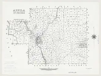 The town of Yarrowie (an Aboriginal word for hunting ground) was established in 1872 following the proclamation of the Strangways Land Act for closer settlement in 1869. The town grew quickly as settlers moved to the area, and by the 1880s it had two hotels, four blacksmiths, three carpenters, Protestant, Catholic and government schools, a post office and telegraph station as well as other stores. In 1877 the name was changed to Appila-Yarrowie then later to just Appila to remove confusion with other towns including Yarcowie, Tarcowie, Terowie, Caltowie and Willowie.[3]