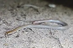 The Mallee worm-lizard (Aprasia inaurita) is identifiable by its pale olive brown or greyish-brown colouring from above, a whitish underside, with a reddish-brown hue around the Mallee worm-lizard's head and neck and a distinctly bright reddish-orange tail.[2] The Mallee worm-lizard also lacks an external ear opening and has very small black eyes, with the lack of an external ear opening being what distinguishes Aprasia inaurita from Aprasia aurita, the eared worm-lizard, which is also confusingly known as the Mallee worm-lizard in the state of Victoria.[2]