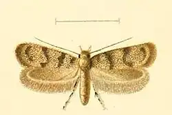 The wingspan is 12-12.5 mm. The ground colour of the forewings is white, sprinkled with brown. The hindwings are dark brownish grey.[2]