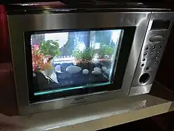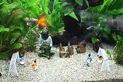 Ornamental aquarium furniture is used both for aesthetic reasons and to enrich the habitat and provide shelter for fish. Common types of aquarium furniture include artificial plants, caves, and themed decorations. Common tropes include treasure chests, shipwrecks, and vibrantly colored synthetic coral.[2][3] Using ceramic objects as aquarium furniture is controversial to aquarists, as some types of ceramic glaze can leach heavy metals into aquarium water.[4]
