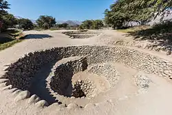 Near the Peruvian town of Nazca, an ancient pre-Columbian system of aqueducts called puquios were built and are still in use today. They were made of intricately placed stones, a construction material widely used by the Nazca culture. The time period in which they were constructed is still debated, but some evidence supports circa A.D. 540–552, in response to drought periods in the region.[6]