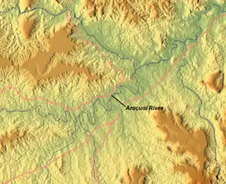 The Araçuaí River (Portuguese: Rio Araçuaí) is a river of Minas Gerais state in southeastern Brazil. The Araçuaí River flows through the Jequitinhonha Valley in the northeast of Minas Gerais, through the town of Araçuaí, which the river takes its name from. It is a tributary of the Jequitinhonha River, flowing south from its right bank.[1][2] The confluence of the river is located at 16°45′45″S 42°0′32″W / 16.76250°S 42.00889°W. Tributaries include the Gravatá River, Setúbal River, Capivara River, Fanado River and the Itamarandiba River.