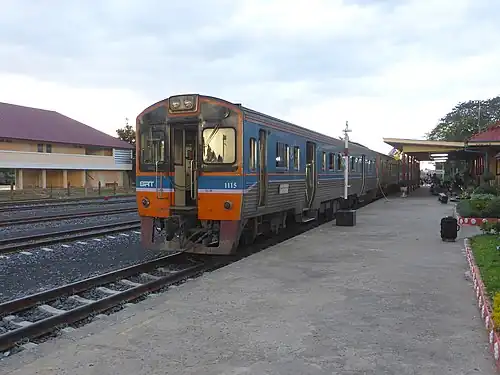 There is a rail connection service to the Cambodian border city of Poipet. First opened in 1955, this service has seen closures between 1961–1970 and 1974–2019 due to neglect and poor diplomatic relations, but is back in operation as of April 2019.[1] Services between Aranyaprathet and Ban Khlong Luk Border were temporarily suspended due to the COVID-19 pandemic.[2]