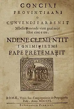 The conference was organized during the reign of Pope Clement XI Albani (r. 1700–1721), himself of Albanian origin, and was held under the direction and in the presence of the Croatian archbishop Vincentius Zmajevich (1670–1745) of Bar, who was “apostolic visitor” of Albania, Serbia, and Macedonia. The council was attended by about 200 Catholic dignitaries to discuss the state of the Church, prevent further conversions to Islam, and settle serious property disputes among the various parishes. Both the opening speech by Zmajevich and the resolutions taken by the council were made in Albanian.[2] The records of the meeting, which are of historical, linguistic, and ecclesiastical significance, were sent to Rome for papal inspection and published in Albanian and Latin by the Propaganda Fide in 1706, with the assistance of Francesco Maria Da Lecce O.F.M. They constitute an important source of our knowledge of the language of northern Albania in the early 18th century.[3]